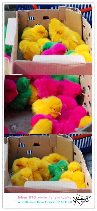 진짜 저런짓하는 인간들한테 정떨어진다.. 저거 어떻게염색하는지 아시죠? 새끼들그냥 염색통에 수백마리쏟아부은다음에 채반으로 건지는거에요 저 약한 병아리들 귀속에 염색약들어가서 귀는멀고 눈알까지염색된다죠.. 해도해도너무하죠.. 저걸 어른들이사겠습니까.. 아이들장난감용으로 가지고놀다가 죽으면버리는.. 인간들 날이갈수록 그 잔인함이 하늘을 찌르는군요.