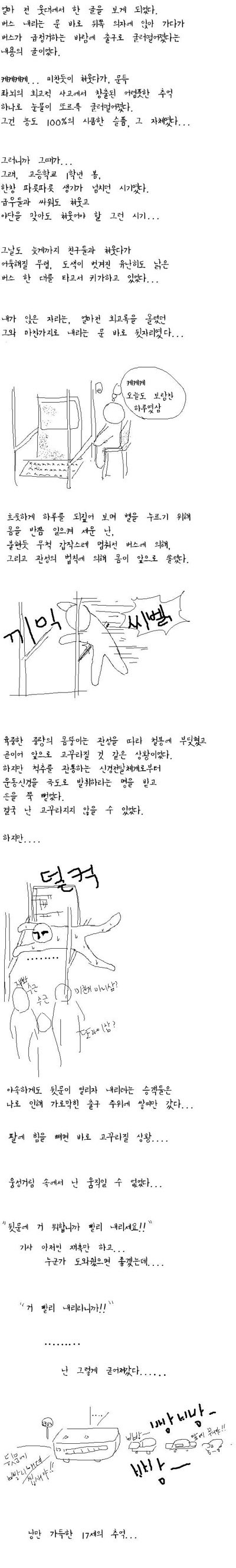 한참 건물 사진을 찍고(경비를 피해)돌아다니다 그만 경비에게 걸려 버렸습니다. 이거 도망은 가야겠고 그렇다고 숨을 곳은 없고 그래 튀자 하며 막 달렸습니다. 그런데 이게 왠걸 전 의식없이 그냥 쓰러지고 말았습니다. 왜 일까요? 건물 전면유리에 그냥 박아 버린거죠.(유리가 넘 투명해 유리가 없는줄 알고) 아무 생각없이 일어서선 전 그냥 조용히 나갔습니다. 점심시간이라 사람들도 디따 많았는데 왜이리 쪽팔리던지, 경비 아지씨 다른때 같았으면 사진기 압수하고 필름 주라구 했을텐데 그냥 멍하니 처다보며 보내 주더군요. 그래두 아픈건 참을만 했는데 그때 애인이랑 같이 갔었거덩요. 이 슬픔, 쪽팔림