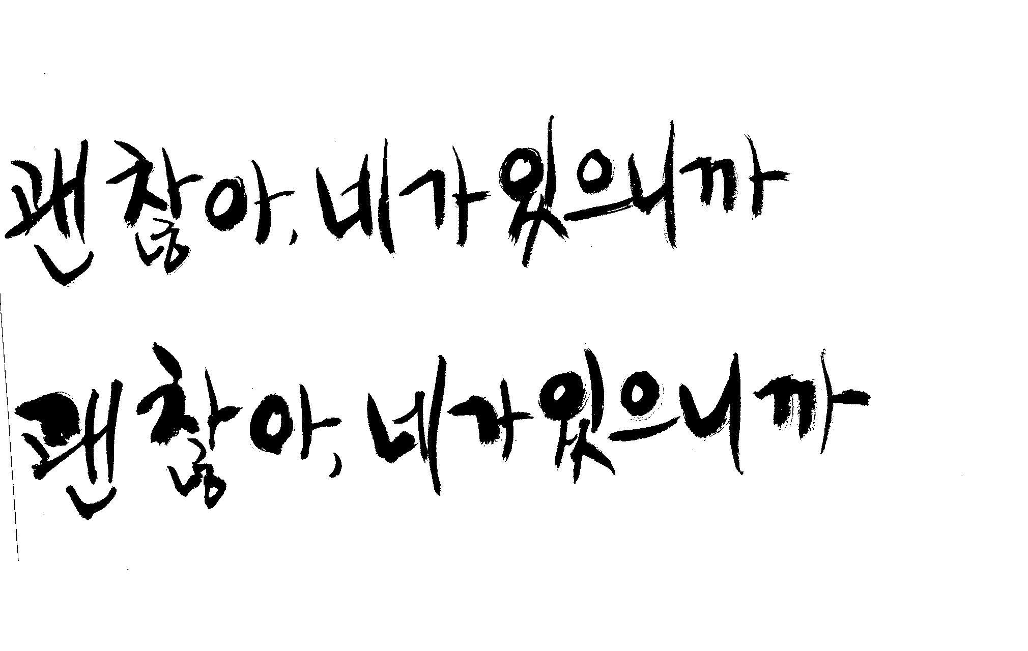 캘리 하나 부탁드릴께요. 김철호 일반 0 7121 2009.01.06 22:48 > > > > > 지금 작업중인 표지가있는데 > > > > 손글씨로 한번 작업해보려구요 > > > > 부탁드립니다. > > > > 괜 찮아, 네가 있으니까 > > >