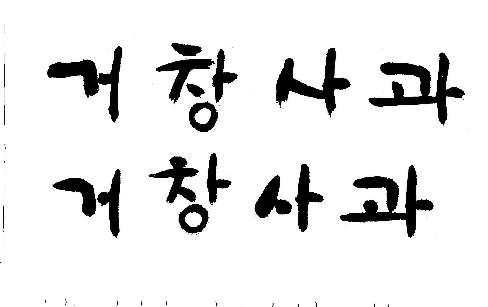 캘리 부탁드립니다. 김철호 일반 0 9948 2008.12.29 16:02 > > 안녕하세요? > 전문대 졸업하고 편집일 하다가 > 얼마전에 패키지쪽으로 이직했습니다. > '거창사과'라고 박스 디자인 주문이 왔는데요 > 일반적인 서체를 사용하니 기존 박스랑 별 차이가 없네요 > 많이 바쁘시겠지만 '거창사과' 캘리 부탁드립니다. > 유용하게 쓰시길..